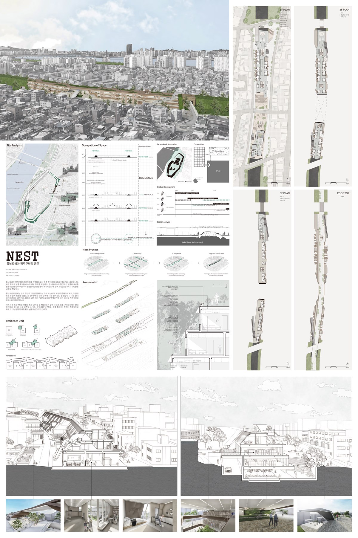 전체적인 매스 개념은 토성을 찢고 주거가 박히는 형상이며, 토성과의 연결성을 위해 하나의 곡선적인 흐름을 중심으로 두고 에스컬레이터를 토성에 박히는 형상을 구성하고, 기존의 길을 살리는 광장을 조성하였습니다. 또한 하나의 흐름으로 인해 구획된 구역들을 바탕으로 아래쪽에 주민시설을, 위쪽에 주거를 배치하였습니다. 1층은 주거와 주민시설이 혼합된 공간으로, 주거와 함께 도서관, 카페, 커뮤니티 시설, 돌봄교실을 만들고, 기존의 길을 흐름을 유지한 채 광장을 조성하였습니다. 2층부터는 주거가 주가 되도록 구성하여 토성 박물관, 토성 안내소을 조성하였고, 유닛들 간의 틈을 통해 트임과 채광적인 부분을 보완시키고자 하였습니다. 또한 11m라는 제한된 높이로 인해 한 층의 높이가 3600밖에 되지 않아서, 주민시설의 경우 수직으로 트임을 주어 좀 더 개방적인 공간을 구획하고자 하였습니다.