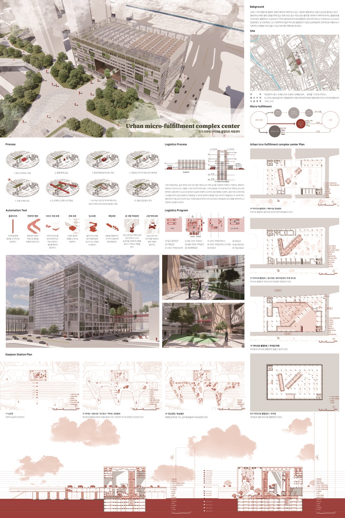 | 설계개요 | 도시 친화형 마이크로 풀필먼트 복합센터 / Urban micro-fulfillment complex center 온라인 구매가 늘어나며 택배 시장의 발전으로 소비자들은 더욱 빠른 배송을 원하게 되어 기존의 택배 시스템과 다른 풀필먼트의 개념이 생겨났다. 풀필먼트는 단순히 물류 아웃소싱이 아닌 고객이 상품을 주문하고 배송받아 보는 모든 과정을 효율적으로 관리하는 물류 체계로 주문과 동시에 풀필먼트 내에서 미리 입고된 상품을 찾아 피킹-패킹-출고 등을 하는 곳이다. 신속한 물류 처리를 위해 물류 로봇을 도입하여 창고 작업 자동화를 시켜 생산성을 높였다. 물류창고가 점점 도심으로 들어서며 도시공간에도 물류센터를 필요로 하고 있다. 현재 물류센터는 도시 친화적 건물이 아니기에 본 연구는 마이크로 풀필먼트가 도시 친화적인 건물이 되려면 어떻게 해야 하는지 계획하고 이를 제안한다. |