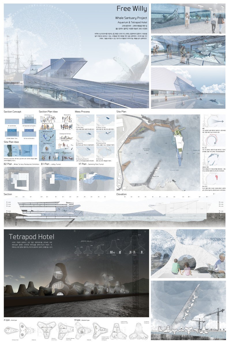 오늘날 도시와 건축에 숨겨진 가치를 탐구하고, 그 이상을 표현하는 ‘일상이상 이상일상’을 주제로 한 졸업 작품전에서 ‘Free Willy’는 멸종위기에 있는 고래를 테마로 프로젝트가 진행되었다. 다소 생소한 동식물군으로 여겨지는 고래를 리서치하면서 부지는 과거 고래가 많이 잡혔던 울산으로 귀결이 되었고 적정한 해안가를 선정하여 대지를 선정하였다. 지형과 자연요소를 적극활용하여 기존 아쿠아리움 건축적 유형을 넘어서 항만 안에 거대한 자연 서식지를 제안하는 계획안으로 주변 맥락과의 강한 연계성 보여준다. 또한 계획된 시설군의 활성화 측면을 고려하여 부지 내 존재하고 있었던 테트라포트(방파제)를 작은 호텔로 변형하여 타입별로 제안하는 재기발랄함을 갖추고서 프로젝트의 전체적인 계획 밀도는 강화된다. 주제에 대한 집중력 있는 리서치와 논리적인 분석력이 돋보이며 유형적 형태(테트라포트)의 프로그램적 변형에 대한 제안이 작품에 대한 균형과 신선함을 환기한다.