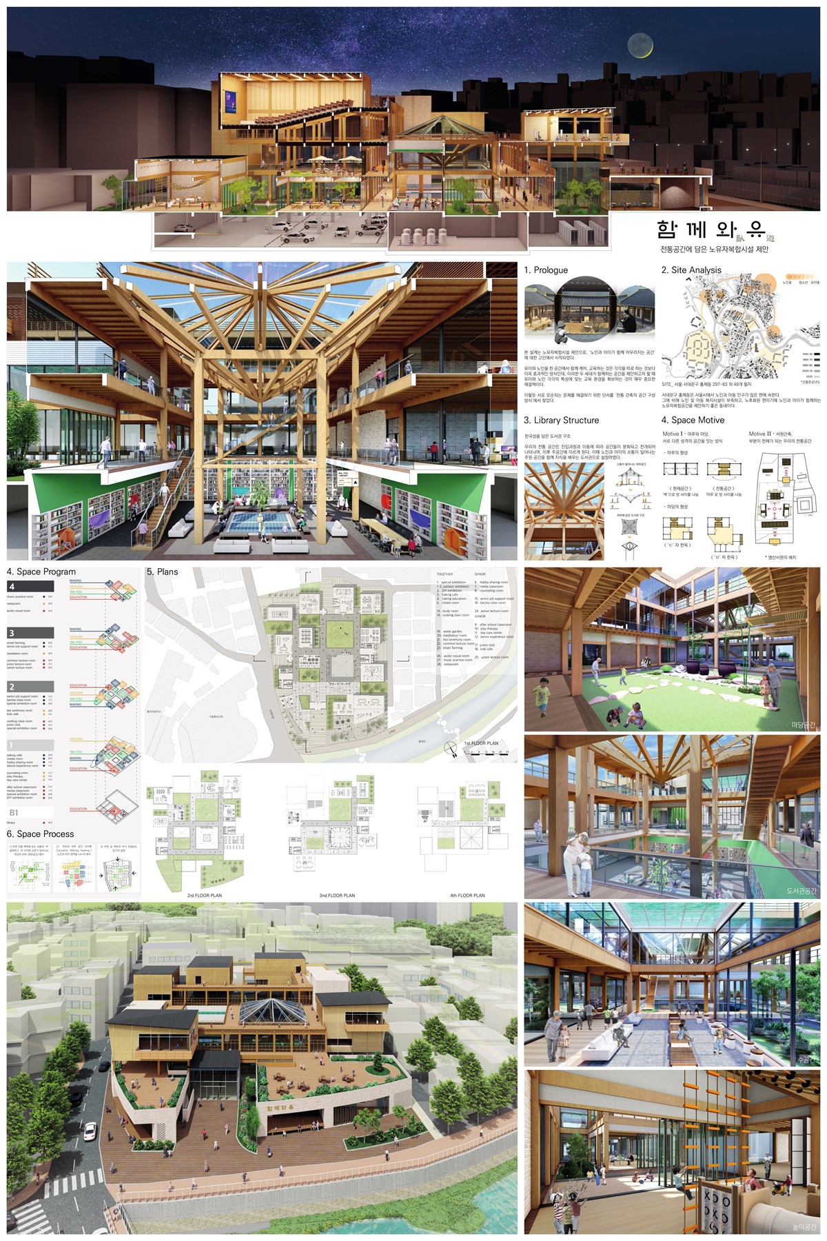 우리의 전통 공간은 진입과정과 이동에 따라 공간들이 분화되고 전개되어 나타나며, 이후 주공간에 이르게 된다. 또한 주된 공간과 부속 공간이 달리 조성되며 기능에 따라 공간이 분리되고 질서가 형성된다. 노인과 아이의 소통이 일어나는 주된 공간을 도서관으로 설정하여, 함께 지식을 배우고 공유하는 공간이 핵심이 되도록 하였다. 이때 도서관은 마치 처마 아래에서 책을 읽는 듯한 분위기를 내고자 처마를 재해석한 현대식 목구조로 제안하였다.