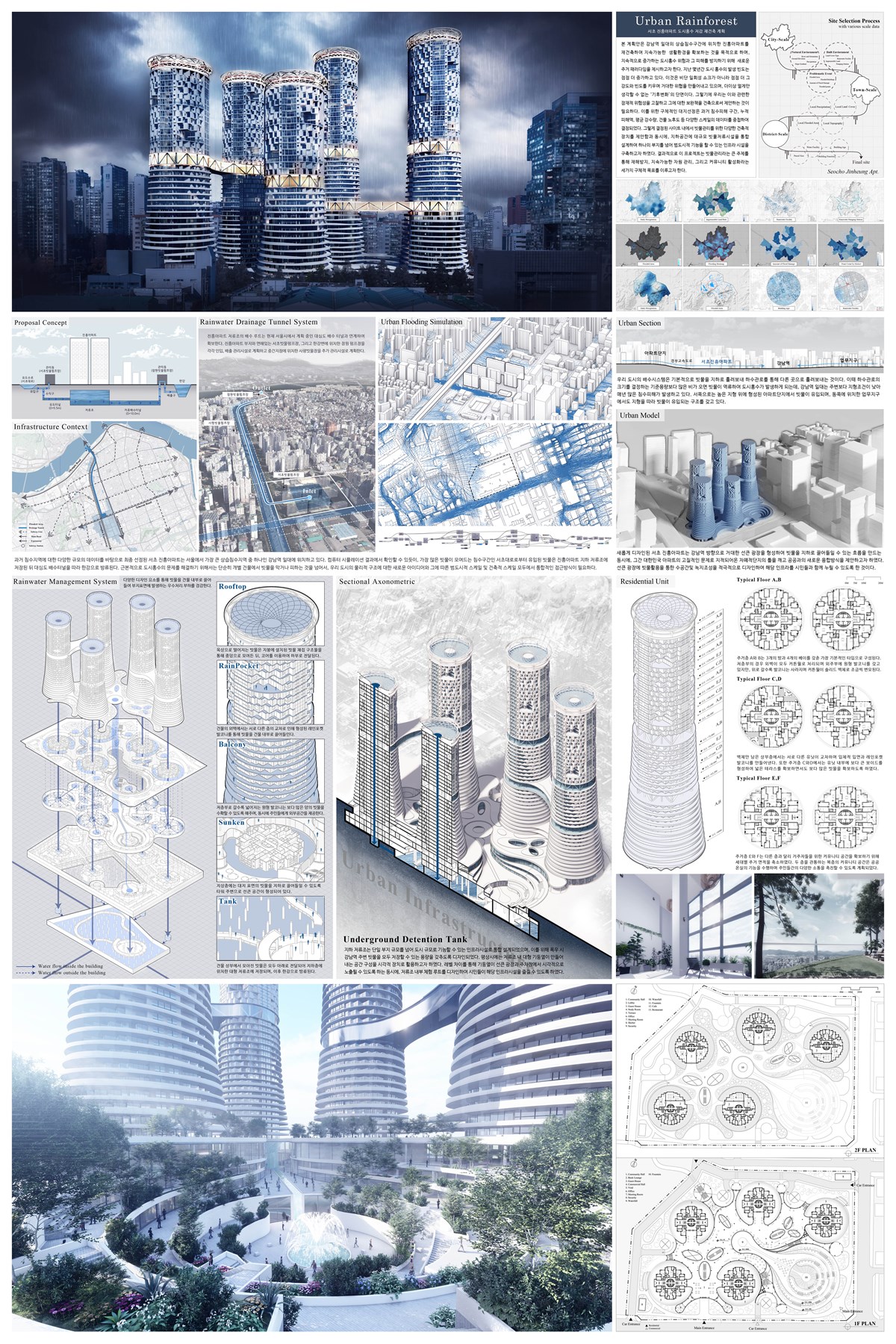 이 프로젝트는 바로 이 도시홍수라는 문제에 천착하여, 그것과 함께하는 지속가능한 삶이라는 주제를 가지고 서초의 진흥아파트를 새롭게 디자인하는 것이다. 해당 대지의 선정은 과거 침수피해 구간, 누적 피해액, 평균 강수량, 건물 노후도 등 다양한 스케일의 데이터를 중첩하여 결정되었다. 결과적으로 선정된 이 대지는 많은 사람들에게 상습침수구역으로 잘알려져있는 강남역 일대 구간에 위치하고 있으며, 현재 재건축 논의가 활발하게 진행되고 있는 노후 주거 단지이다.