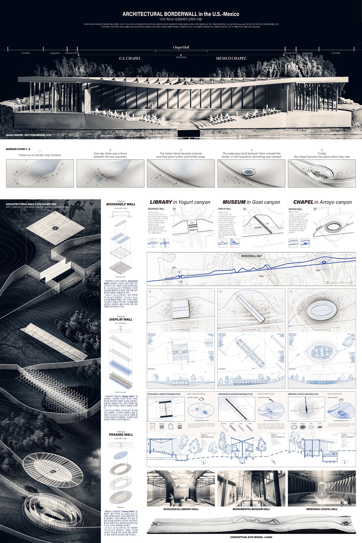 본 프로젝트, ‘Architectural Borderwall’은 쌍둥이 도시인 샌디에고와 티후아나의 이중장벽 사이를 지속적 생산지대로 탈바꿈하는 재개념화된 국경장벽을 제안한다. 이 프로젝트의 유의미한 점은 미국과 멕시코의 국경장벽 뿐만 아니라 세계의 건설된 장벽에 대한 ‘건축적 선언’이다.