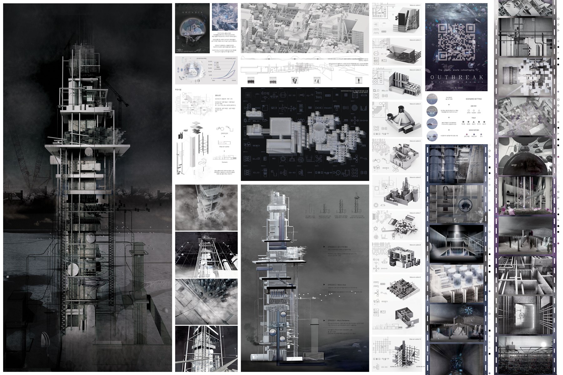 우리가 버리는 플라스틱 쓰레기는 ‘미세 플라스틱’이라는 작은 입자로 쪼개져 해양 생물의 먹잇감이 되고 우리의 식탁에 오른다. 플라스틱으로 인해 맞이할 미래를 가정한 연구 결과로 2050년 플라스틱의 지속적인 사용으로 인한 디스토피아적 상황을 가정해보며 최악의 가상 시나리오를 만들었다. 이 시나리오 안에서의 갈등은 건축적 장치들을 덧붙임을 통해 고조되며, 특정 계층만을 위한 자연의 이상향 공간인 ‘아르카디아’ 내에서 인간의 끝없는 욕망은 건축 공간으로 구현된다. 플라스틱의 위협으로부터 생존하기 위해 인간이 만들어내는 최후의 건축공간은 방어적, 공격적, 감시의 3가지 감정으로 건축 공간이 묘사된다. 건축을 매개체로, 플라스틱 사용으로 인한 디스토피아적 시나리오를 통해 플라스틱을 사용하는 모든 이기적 집단에 메시지를 전달하고 싶다. 또한 건축을 생활하기 위한 공간이 아닌, 재난 시대의 생존을 위한 이기적인 현대인들을 비춘 공간의 새로운 패러다임을 제안한다.