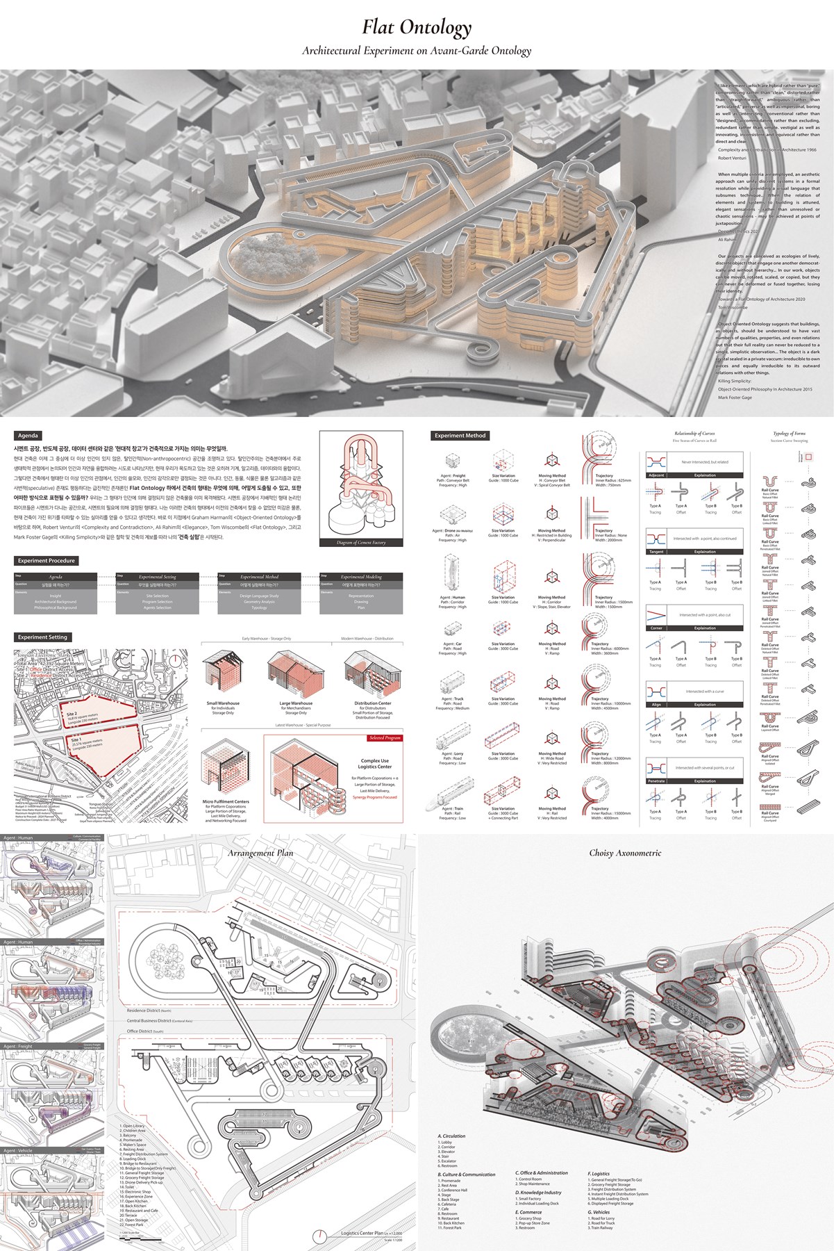 작품설명 본 프로젝트는 네 명의 건축가의 글과 건축이론을 인용/편집하며 시작한다. 다음은 그중 일부이다. 1. Complexity and Contradiction in Architecture, 1966 - Robert Venturi "나는 건축의 요소 중 "순수함"보다는 혼성을, "깔끔함"보다는 타협을, "솔직함"보다는 뒤틀림을, "뚜렷함"보다는 애매함을... 직접적이고 명확한 것보다는 모순되고 불분명한 것을 선호한다." 2. Deep Aesthetics, 2021 - Ali Rahim "(건축에서) 다양한 영역이 포용되어야 할 때, 심미적 접근법은 이 이산적인 시스템들을 기술을 포함하는 시각적 언어로서의 형태로 통합할 수 있다... 다양한 요소와 시스템의 관계가 건축에서 조화를 이룰 때, 그 병치에서 해결되지 않거나 혼란(chaotic)한 감각이 아닌 우아한(elegant) 감각이 획득될 것이다." 3. Towards a Flat Ontology of Architecture, 2020 - Tom Wiscombe "우리 프로젝트는 생기 있고 이산적인 객체들의 위계 없고 민주적인 관계 맺음에 대한 생태학으로 인식된다... 우리의 프로젝트에서 객체는 이동되거나, 회전되거나, 규모가 변경되거나, 복제될 수는 있지만 절대로 변형되거나, 융합되어 그들의 정체성을 잃지는 않는다." 4. Killing Simplicity: Object-Oriented Philosophy in Architecture, 2015 - Mark Foster Gage "객체 지향 존재론은, 그들이 말하는 객체와 같이, 건축도 수많은 특성과 속성 그리고 관계들 속에서 이해되어야 하며, 그러면서도 건축의 실존은 단일하거나 단순한 관찰에 의해 축소되어 이해돼서는 안 될 것이라는 관점을 제시한다... 객체란 자기 자신의 조각들로도 환원될 수 없고, 그것의 외부적 관계로도 환원될 수 없는 진공으로 봉인된 크리스탈이라 할 수 있다.“ 이에 따라 본 프로젝트가 진행하고자 하는 ‘건축 실험’은 다음의 세 단계를 거친다. 1. Tom Wiscombe와 Mark Foster Gage의 이론으로 바탕으로, 내가 건축에서 고려할 수 있는 "객체"란 무엇일까? (무엇을 실험해야 하는가? 실험의 Setting) 2. 그 객체들을 고려하면서 어떻게 Ali Rahim이 말한 통합적 디자인 언어를 바탕으로 한 Elegance한 아름다움을 이끌어 낼 수 있는가? (어떻게 실험해야 하는가? 실험의 Method) 3. 이와 같은 프로젝트들은 어떠한 방식으로 Representation 될 수 있는가? (실험을 어떻게 보여줘야 하는가? 실험의 Modeling) 이러한 과정을 거친다면, 위의 건축가들이 언급한 Flat Ontology, 즉 인간 이외의 모든 객체, 동물은 물론 심지어는 알고리즘, 이데올로기와 같은 사변적인 존재들도 인간과 동등한 위치에서 고려되어야 한다는 이 급진적인 존재론을 건축적으로 실험해 볼 수 있을 것이다. - Setting 본 프로젝트에서는 이론적 배경에 대한 강조점이 흔들리지 않게 하기 위하여, 새로운 프로그램을 만들어서 설득하는 단계까지는 접근하려 하지 않았다. 오히려 이미 존재하는 프로그램 중 적절한 실험의 대상이 될 수 있는 프로젝트를 발견하려 했는데, 정부에서 추진 중인 "Y-Valley 프로젝트"는 이러한 의도에 적합했다. Y-Valley 프로젝트는 쇠퇴한 용산전자상가 일대를 (1) 기존 용산전자상가의 정체성을 살리면서도 디지털 콘텐츠와 연계하여 재개발의 당위성을 강화하고, (2) 용산역과 연계한 화물 기차 시스템, 드론을 이용한 배송 시스템을 포함한 스마트 통합물류 시스템을 구축하며, (3) 지역사회와 상생할 수 있도록 하는 세부적 내용을 추진하는 것이 골자이다. 스마트 통합물류 시스템은 배송의 루트를 다각화하는 것에 성패가 달렸고, 정부의 지역사회와 상생 의지가 강력하여 주변 맥락에 맞는 다양한 건축적 요구들을 수용해야 한다는 점에서 '실험의 장'으로 채택하기에 적합하였다. 이에 따라 프로젝트에서 고려하고자 하는 객체를 물류 / 드론 / 인간 / 승용차 / 탑차 / 대형 로리 / 화물 열차로 선정하였고, 이들은 끊임없이 움직이는 존재이기 때문에, 소프트웨어적 관점에서 이들을 Agent로 명명하여 이들의 물리적 다양성과 한계에 대해 분석하였다. 이 과정에서 이들은 반드시 이동해야 하는데, 그때 만드는 궤적이 있다는 것에서 디자인 언어에 대한 힌트를 얻을 수 있었다. - Method 이에 따라 자연스럽게 얻어진 ‘통합적 디자인 언어’는 ‘Line’과 ‘Fillet’이다. 이 언어에 따라 선들이 가질 수 있는 기하적 관계(Align, Tangent 등)에 대해 탐구하고, 그 분류를 세분화하였다. 또한 그들이 건축 공간화될 수 있는 방법에 대해 탐구하였다. 이들은 단순히 거대하고 순수한 기하적 형태에 뭉뚱그려져서 존재하는 것이 아니라, 요소들 하나하나가 살아있고, 설령 없어지더라도 흔적을 남기는 방식으로 존재해야 했다. 이에 따라 다양한 공간의 단위가 도출될 수 있었다. 마지막으로는 이것들을 조합하여 최종적 형태를 만들어내었다. 북측이 주택단지에 위치하고, 남측은 용산국제업무 단지에 위치함에 따라 북측은 레스토랑, 식료품점/창고형 마트와 같이 물류센터의 장점을 활용하면서도 주변 환경과 협응 할 수 있는 프로그램을 중심으로 배치하였고, 남측은 오피스, 물류센터, 아파트형 공장과 같이 물류가 집약되어 다양한 방식으로 배송이 가능하면서도 용산국제업무 단지와 어울리는 프로그램으로 배치하였다. - Modeling 전체적인 프로젝트에서 Perspective View로서의 평가는 제외