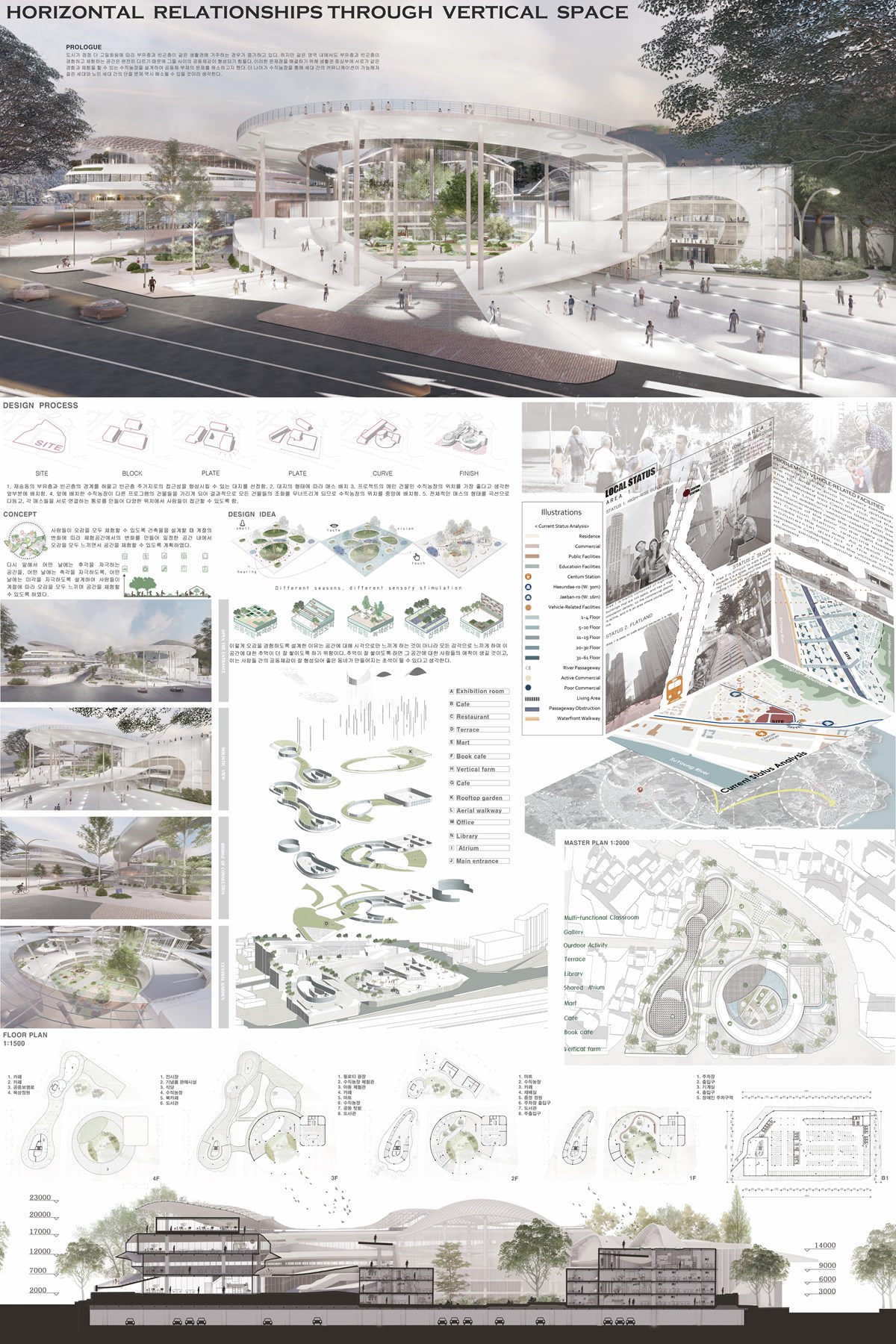 도시가 점점 더 고밀화됨에 따라 부유층과 빈곤층이 같은 생활권에 거주하는 경우가 증가하고 있다. 하지만 같은 영역 내에서도 부유층과 빈곤층이 경험하고 체험하는 공간은 완전히 다르기 때문에 그들 사이의 공동체감이 형성되기 힘들다. 이러한 문제점을 해결하기 위해 생활권 중심부에 서로가 같은 경험과 체험을 할 수 있는 수직농장을 설계하여 공동체 부재의 문제를 해소하고자 했다. 더 나아가 수직농장을 통해 세대 간의 커뮤니케이션이 가능해져 젊은 세대와 노인 세대 간의 단절 문제 역시 해소될 수 있을 것이라 생각한다.