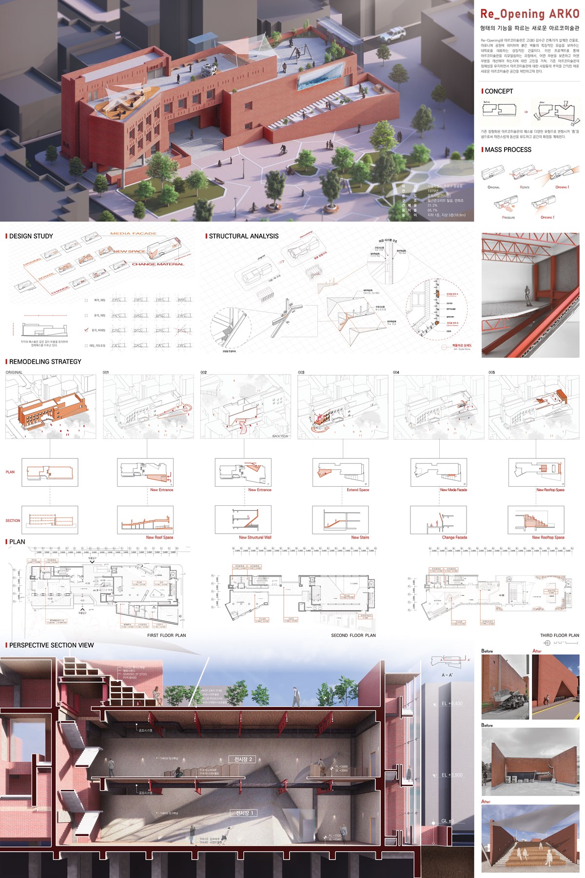 Re-Opening된 아르코미술관은 고(故) 김수근 건축가가 설계한 건물로, 마로니에 공원에 위치하여 붉은 벽돌의 특징적인 모습을 보여주는 대학로를 대표하는 상징적인 건물이다. 이번 프로젝트를 통해 아르코미술관을 리모델링하는 과정에서, 어떤 부분을 보존하고 어떤 부분을 개선해야 하는지에 대한 고민을 거쳐, 기존 아르코미술관의 정체성을 유지하면서 아르코미술관에 대한 사람들의 추억을 간직한 채로 새로운 아르코미술관 공간을 제안하고자 한다.