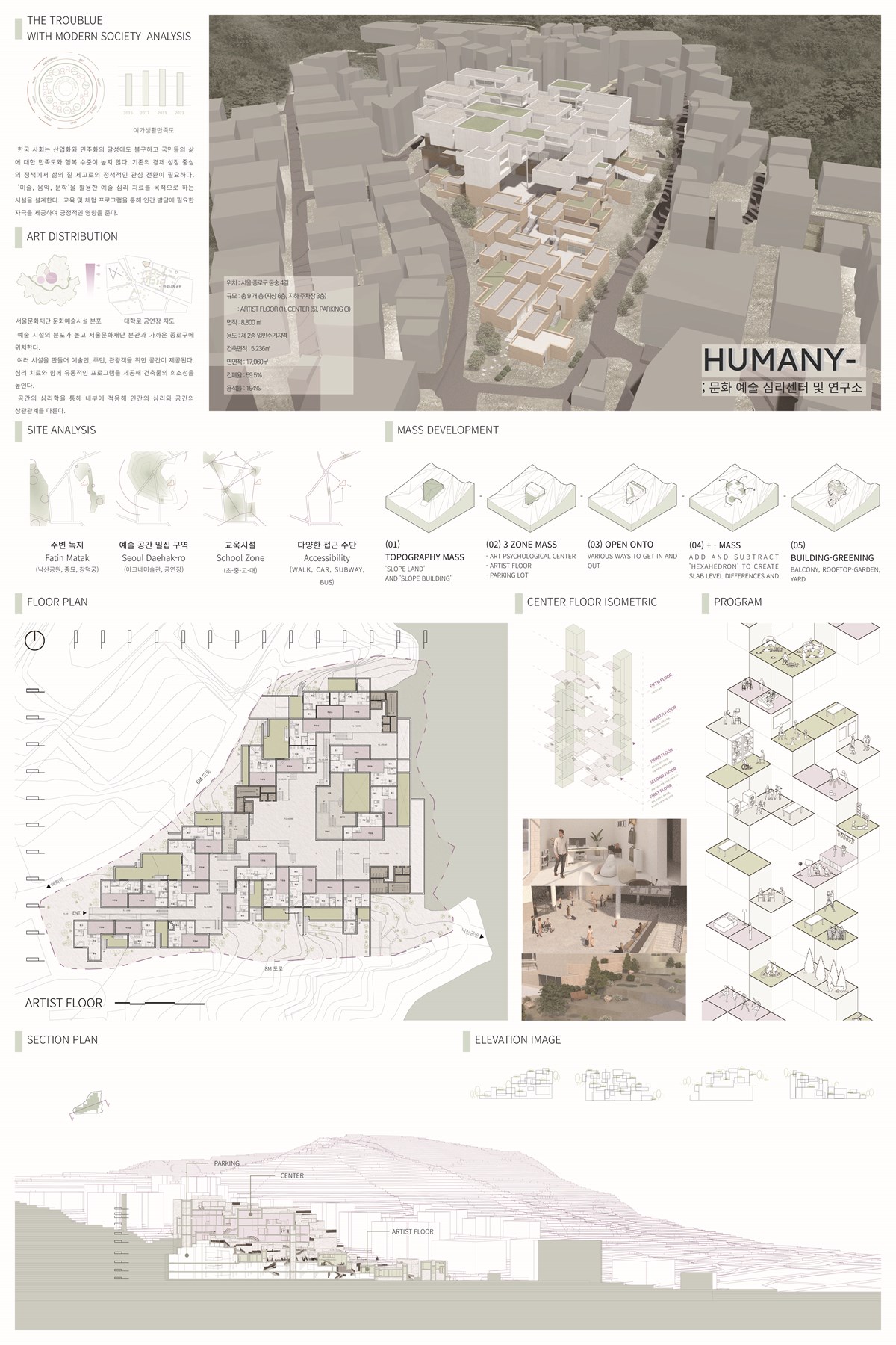 이 프로젝트에서는 대학로의 문화예술공간과 인접한 대지를 활용하여 예술심리치료 컴플렉스를 제안하고 있다.