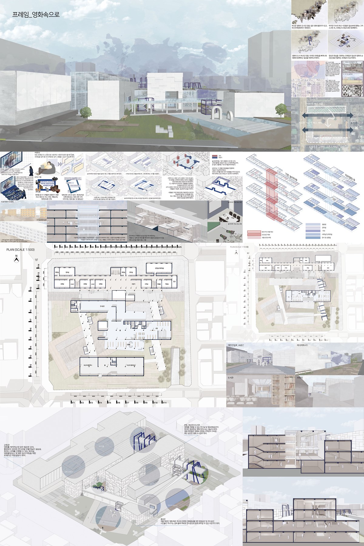 | 작품설명 | 부산진구에 위치한 서면 놀이마루를 리모델링 및 신축한 '영화도서관'이다. '영화 도서관'이란 영화와 관련된 도서 및 기록물, 소장품들을 아카이브 및 전시하고, 영화와 관련된 교육 및 새로운 영화, 촬영지, 배우들을 소개하고 연결하는 '영화'라는 컨텐츠로만 구성된 도서관이다. 영화의 도시라고 불리는 부산에 부산시민들이 일상속에서 쉽게 영화를 접하고 함께할 수 있는 공간이 영화관을 제외하면 없다고 판단하여 부산에서 유동인구가 많은 상업공간인 서면에 시민들이 쉽게 이용가능한 복합문화공간인 도서관을 매개체로 영화관련 컨텐츠를 제공하는 공간을 계획하였다. 관광지의 성격보다는 부산 시민들이 일상생활속에서 영화와 가까워질 수 있는 공간을 제공하는 방향성이 주된 목표인 만큼 시민들이 자유롭게 열람할 수 있는 영화테마의 도서관을 중심으로 구성하였다. 그리고 영화와 관련된 전시/홍보 공간(홍보관), 개인 혹은 단체로 영화를 관람할 수 있는 공간(영상관)을 구성하였고 기존의 놀이마루 건물은 리모델링하여 영화인들을 양성할 수 있는 교육공간(교육관)으로 구성하였다. 이러한 공간들은 교육관, 영상관, 도서관, 홍보관으로 분동되어있으며 각 공간들은 영화의 순간들을 연결하는 '영화 필름 프레임'을 형상화한 브릿지로 연결된다. 부산시민들의 일상 속에 '영화 도서관'이라는 새로운 프레임을 걸어, 관광지보단 시민들이 영화와 함께할 수 있는, 영화와 부산시민들을 연결하는 공간을 제공한다. |
