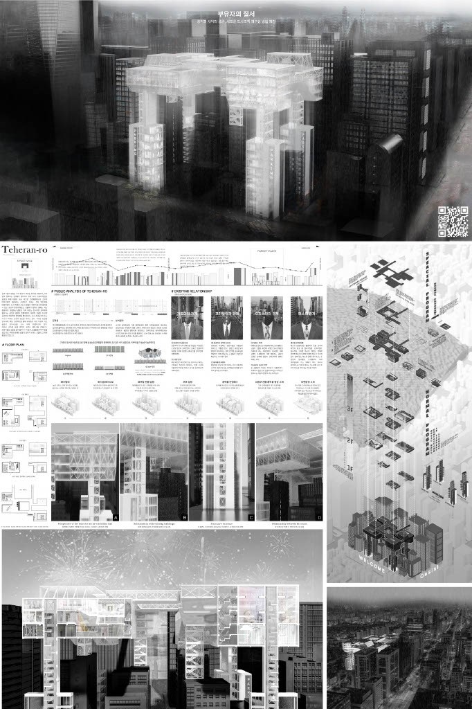 | 작품설명 | [계획의 배경] 1980년대 이후, 서울 강남의 테헤란로는 경제 성장과 함께 사무소 건물의 고층화가 이루어졌습니다. 공공시설에 대한 고려 없이 대형 오피스가 고밀도로 개발됨에 따라 현재는 시민들의 일상과는 단절된 도시 내의 선형 형태의 섬이 되었습니다. 도시적 포화상태에 이른 테헤란로에 현재의 기능을 유지하면서 부족한 공공시설을 계획함으로써 테헤란로의 새로운 변화 방향을 모색해보고자 합니다. [컨셉] 기존의 도시 정비 방식은 기존 건물을 철거하고 높은 건물을 새롭게 세우는 방식입니다. 이 방식은 사적 이익을 우선시하는 구조입니다. 특히, 테헤란로와 같이 지대가 비싼 업무지역에서는 공공시설 투자가 제한적일 수 밖에 없습니다. 테헤란로 주변의 미활용된 부분을 공공에게 돌려주는 방식으로 테헤란로의 잠재력을 이끌어내고자 합니다. 기존의 도시 조직과 건축물을 유지하고 테헤란로 이면부에서 사용되지 못한 용적만큼을 공공시설로 전환함으로써 사적 이익과 공적 이익을 조화시키는 새로운 방법을 제안합니다. 이를 통해 테헤란로 도시 조직의 새로운 프로토타입을 만들고자 합니다. [건축적 표현] 광장은 도시의 중심으로, 사람들이 모여 두려움을 없애고 안전하며 개방적인 환경을 누릴 수 있는 중요한 공공 공간입니다. 본 설계에서는 공공 공간이 부족한 현실과 높이가 가지는 권력의 상징성을 고려하여 광장을 기존의 건물과 연계된 가장 높은 곳에 위치시켰습니다. 전시 공간과 같은 특별 프로그램을 이용하면서 시민들이 자연스럽게 광장으로 이동할 수 있게 계획하였습니다. [종합] 건축 기술의 발전은 항상 새로운 변화를 가지고 옵니다. 이러한 변화과정에서 소수의 사적 이익보다 공공의 이익이 우선시되어야 한다고 생각합니다. 기존의 도시조직과 건물을 유지하면서 이와 결합된 새로운 공공 건축물을 제시하였습니다. 이를 통해 시민이라면 누구든지 이용할 수 있는 공공의 오아시스를 기존 도시 내에 구축하고자 합니다. |