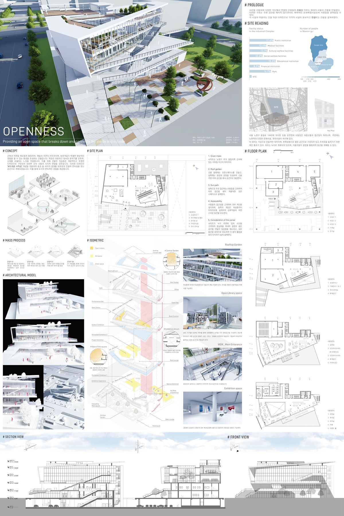 본 작품은 독특하고 매력적인 문화복합시설을 구성하는 능력을 보여주는 뛰어난 계획안이다. 작품의 주요 장점 중 하나는 ‘사선’을 사용하여 연결된 건물들로 이루어진 형태로, 사선의 긴장감이 사람들에게 신선한 느낌을 줄 수 있다는 점이다. 각 건물이 다양한 각도와 시선에서 조화롭게 보이는 것은 방문객에게 새로운 미적 경험을 제공하는 것이 가능할 것으로 기대된다.