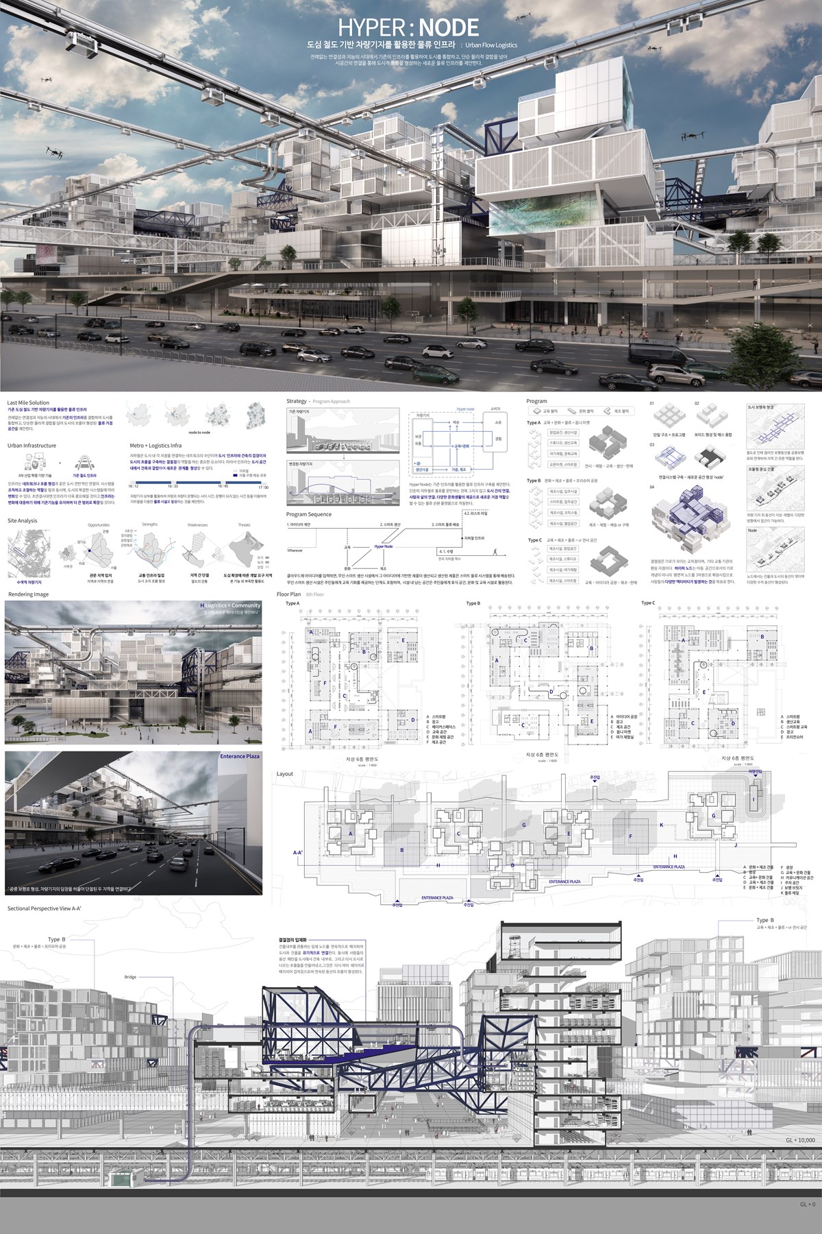 ‘초연결, 초융합, 초지능’이라는 주제로 진행한 건축설계 스튜디오에서 ‘HYPER NODE’는 기존 도심 철도를 기반으로 하는 차량기지를 활용한 물류 인프라 시설로서 차량기지로 인한 도시의 단절을 극복하고, 도시철도의 운영이 멈춘 시간의 교통망을 활용하며, 차량기지 상부 공간의 건축적 축적이 함께 작동하는 새로운 물류 인프라의 제공을 제안한다. 이것은 단순한 물류 공간을 넘어 도시 간의 연결, 사람과 삶의 연결, 다양한 문화생활 제공으로 새로운 거점 역할을 하게 됨으로써 미래지향적인 스마트 도시로의 발전을 도모하는데 정책적으로나 실질적으로나 중요한 역할을 하게 될 것으로 기대된다. 특히 차량기지 주변 주거단지의 확장에 의한 문화, 물류의 불균형과 같은 도시의 확장 시 수반되는 사회적 문제를 극복하기 위한 대안 제시로서도 큰 의미가 있다. 본 작품은 컨셉인 HYPER NODE를 통하여 여러 복합용도로 계획된 대지 내에서 중요한 결절점 역할을 함과 동시에 주변 도시와 물리적, 화학적 결합을 입체적으로 이끌어 내어 ‘초연결, 초융합, 초지능’의 주제를 무척이나 효율적이고 완성도 높은 결과를 도출하고 있다.