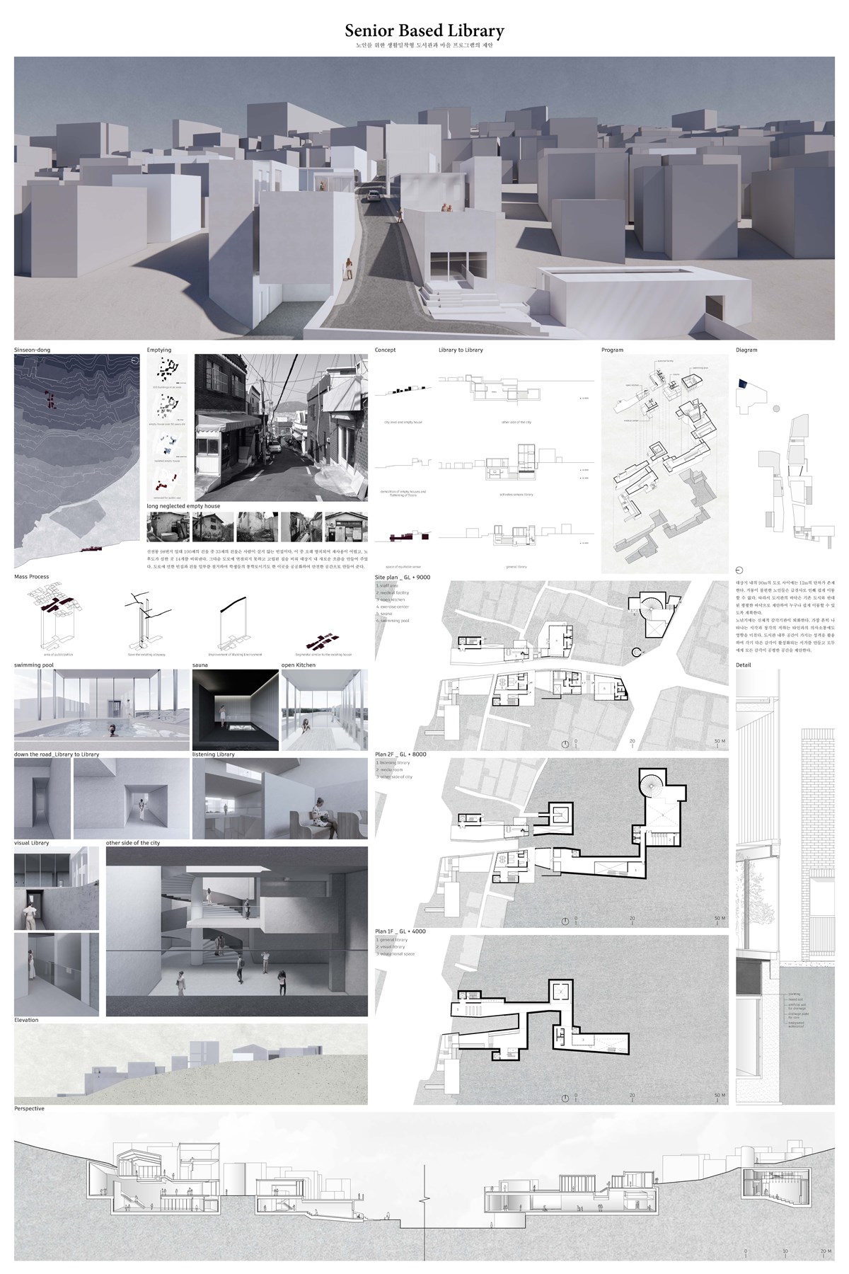 본 프로젝트는 부산 원도심의 슬럼화와 방치된 빈집을 관찰하는 것에서 시작되었다. 빈집을 선택, 관찰하고 대상지의 문제를 해결하는 동시에 고령자를 위한 도서관 프로젝트를 제안한 이 작업은 도시적 재생의 해법과 건축적 완성도 두가지의 목표를 충실히 이루었다. 또한 고령자의 라이프스타일과 오감을 자극하는 새로운 유형의 도서관이라 더욱 아름다우며, 섬세한 건축적 드로잉과 풍부한 단면적 공간에 대한 고민들이 치열하게 전개된 결과물은 조용하지만 깊다.