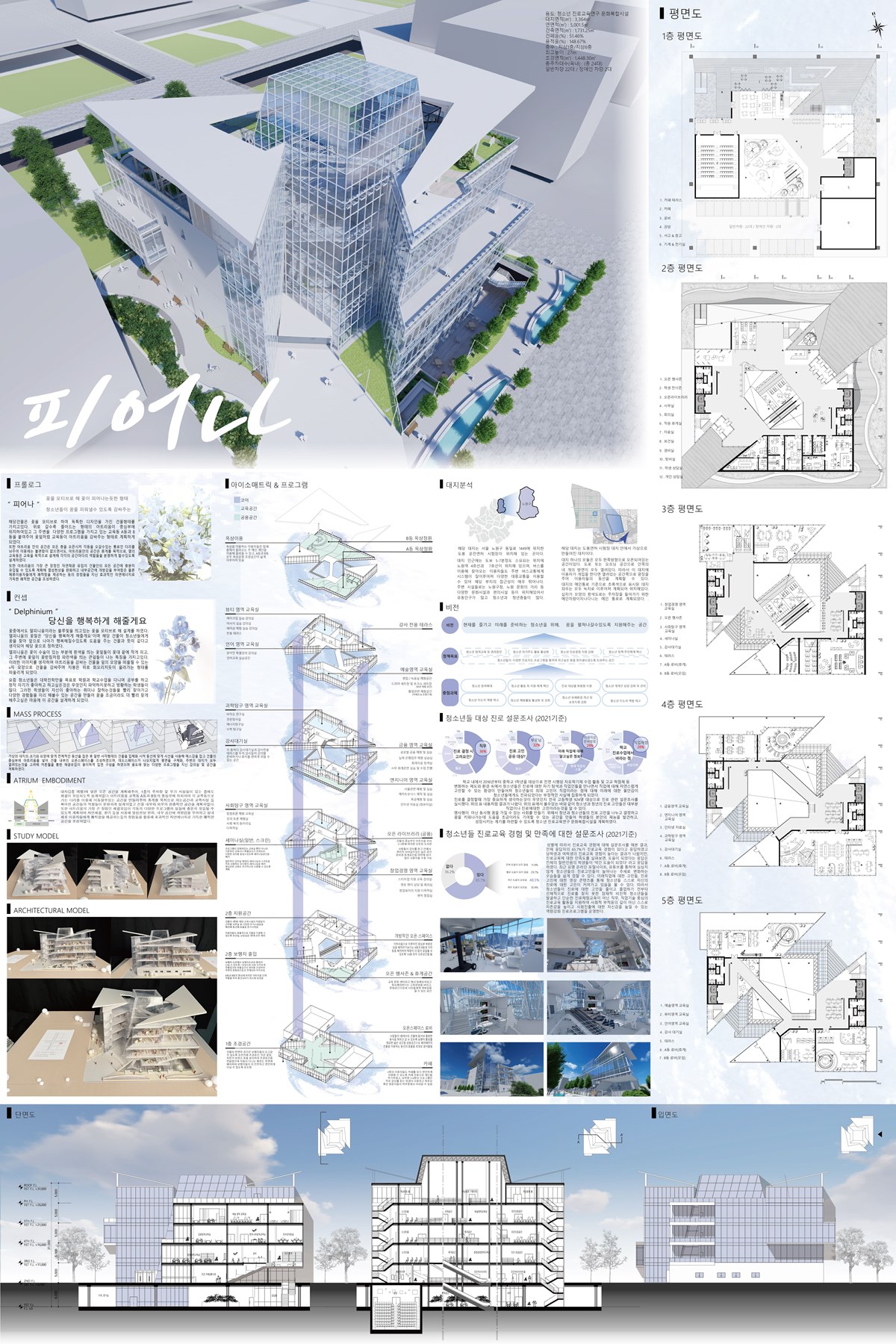 본 작품은 주어진 가상 대지에 사선을 자유롭게 사용하여 역동적이고 독창적인 형태가 될 수 있도록 공간을 구성하여 청소년들이 시각적, 공간적으로 새로운 경험을 할 수 있는 건축물로서 손색없는 뛰어난 계획안이다.