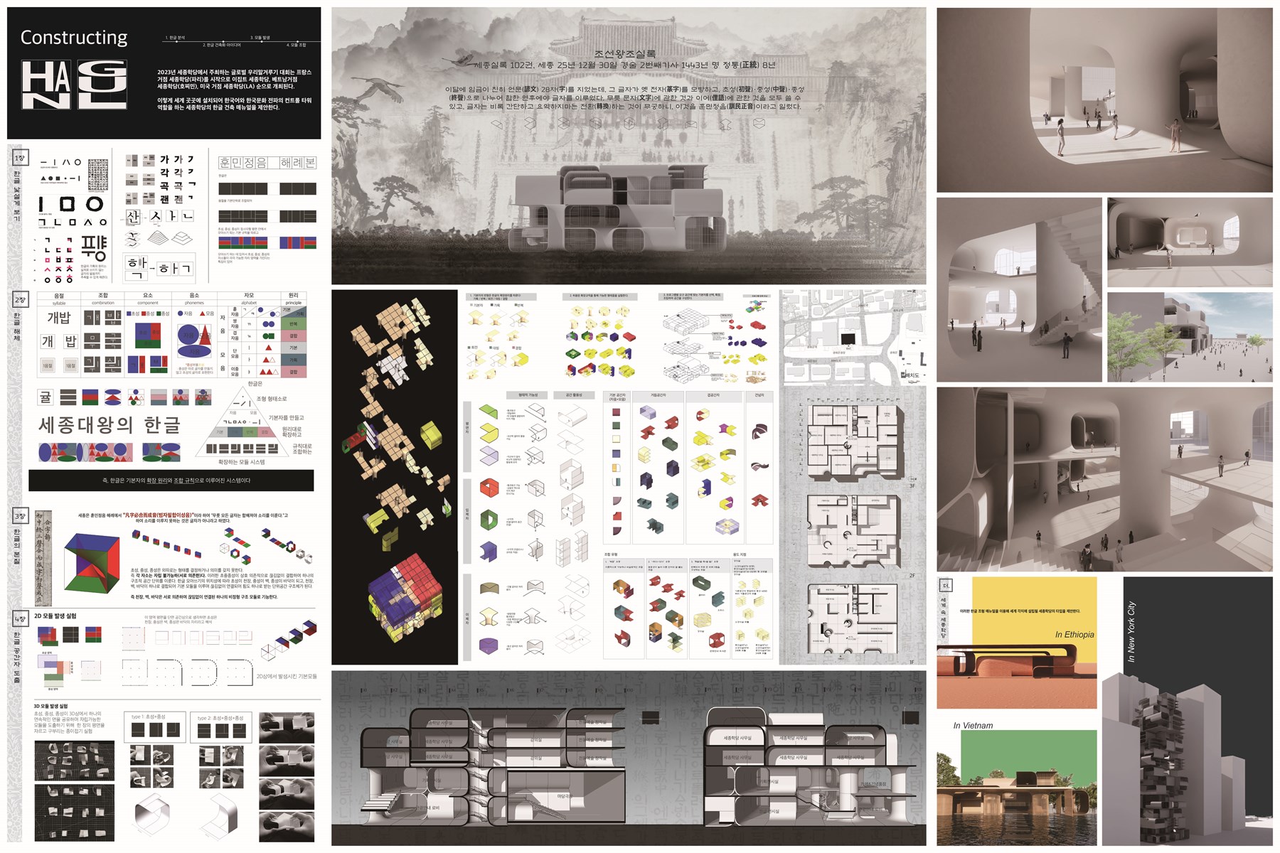 “새로운 건축 유형의 제안을 위하여 발견과 발명, 두 가지 과정에 초점을 맞춘다"라는 졸업설계 스튜디오 목표에 따라 <한글을 건축하다>는 한글에 내재한 원리의 발견을 통해 언어의 건축화라는 새로운 건축 작업에 도전한다. 훈민정음 해례본을 바탕으로 한글의 본질을 추상하고, 이를 건축적으로 전환하는 과정에서 성실한 조사와 아이디어가 인상적인 프로젝트다.