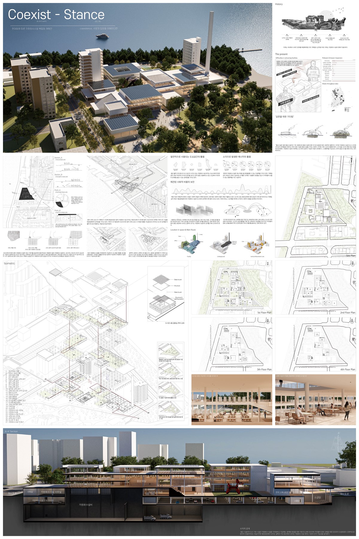 'Coexist-Stance' 는 현 사회에서 문제되고 있는 쓰레기 처리에 대한 이슈를 기점으로 혐오시설과 도시 사이의 관계에 대한 고민으로부터 시작한 프로젝트다. 학생은 자원회수시설과 도시의 관계를 분석하며 서로에 대한 인식 정도를 조절해 나갔다. 자원회수시설을 지하에 구축하며 지상으로 부분부분 드러내 서로에 대한 인식을 끊으면 안 된다는 것이 학생의 주장이었다.
