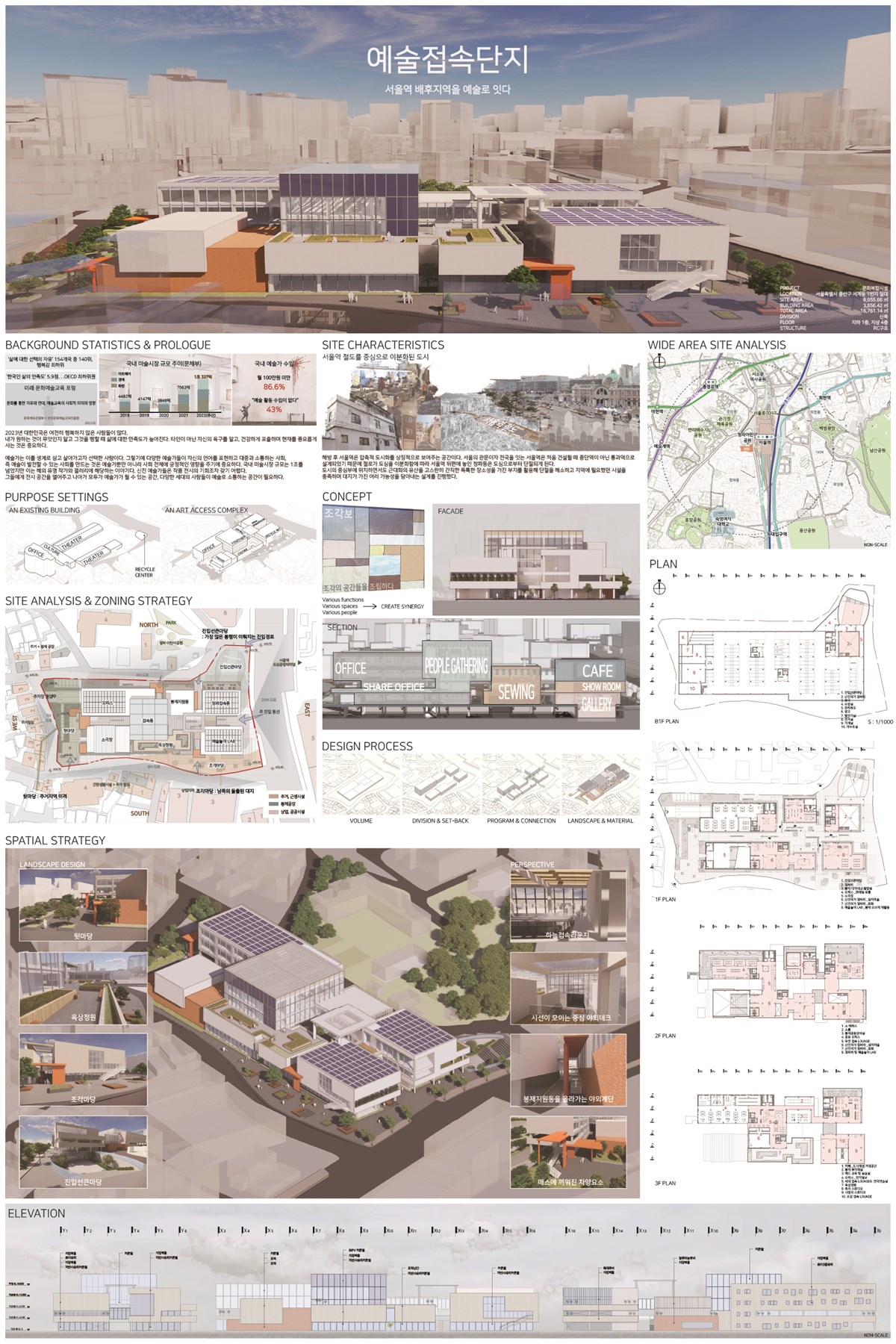 이번 설계에서는 신진 예술가들에게 전시의 기회를 주는 공간을 만들었다. 또한 예술이 다양한 사람들의 일상에 스며들 수 있도록 했고 예술로 소통할 수 있는 공간을 만들었다. 더 나아가서는 사이트가 속해있는 지역의 특성을 살려 지역에 필요했던 봉제 지원실, 봉제 공용 장비실, 의류 디자이너를 위한 공간을 추가했다. 대지가 담고 있는 많은 가능성을 이 “예술접속단지”에서 풀어낼 수 있을 것으로 기대한다.