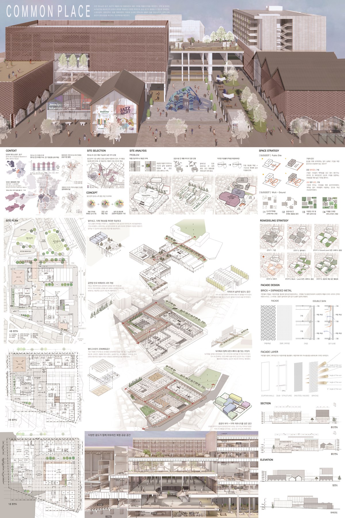 대상지 일대는 경사가 있으며 옹벽으로 인해 단절된 공간들이 도시 곳곳 존재한다. 이는 원도심 속 개방감 부족을 느끼게끔 하는 요소이다. 따라서 막힌 공간이 아닌 바로 진입할 수 있는 오픈 스페이스를 만들어 개방감을 확보하고 거리, 도시의 활기를 되찾으려 한다. 공간 전략으로 일부 시설을 덜어내고, 공간을 더하여 멀티 그라운드를 형성하려 한다. 서로 다른 레벨의 공원, 다양한 내외부 활동을 제안하여 활용도 높은 공공 부지를 계획한다. 이렇게 조성된 공간들은 다양한 각도로 시선이 교차되면서 더욱 활기찬 분위기를 형성하게 되며 건물 내외부가 유기적으로 연결되어 구민들의 접근성, 활용도가 향상된다. 프로그램은 구청, 구의회뿐 아니라 공연장, 공유 오피스, 작은 도서관, 상업 등 다양한 용도가 복합되어 지역 내 다양한 커뮤니티를 담게 되며, 도시적 맥락을 고려한 매스 분절, 벽돌 파사드 디자인 등을 통해 기존 마을 분위기를 해치지 않는 방향으로 설계하였다.